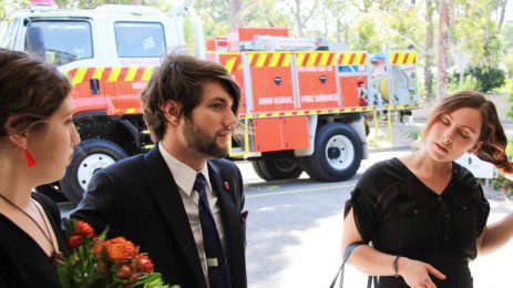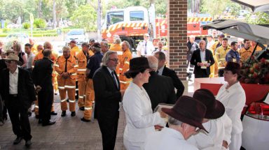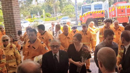 A Guard of Honour lined the aisle for Don to pass by. Volunteers stood to attention as the coffin passed, and the procession was followed by Don’s life partner Sue and brother Bob. Captain of the Ku-ring-gai Brigade Nic Lyons placed Don’s white helmet on the coffin and proceedings got underway.