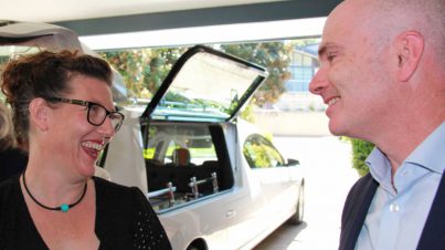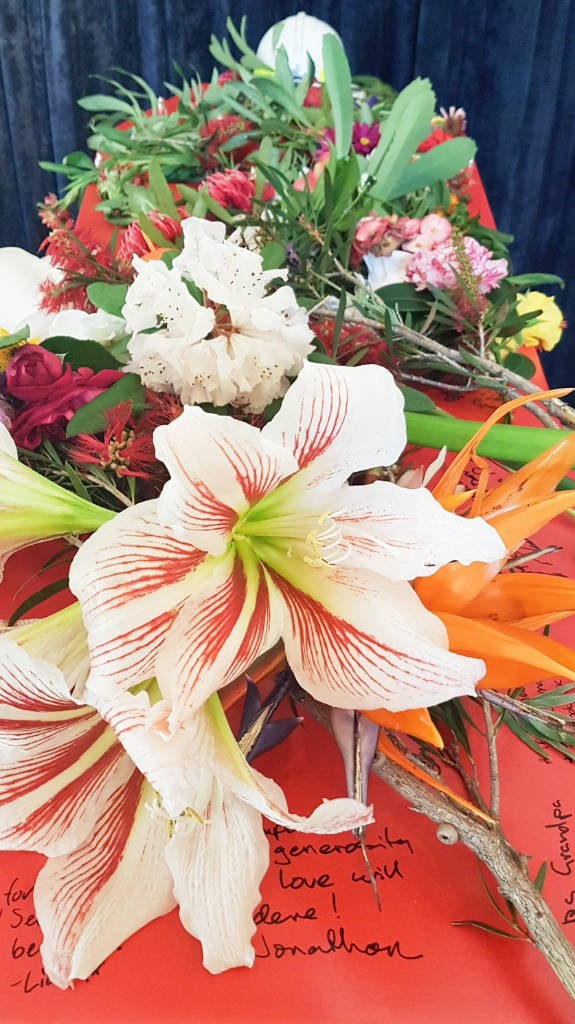 The final part of the service was an invitation by Peter Quinlivan for guests to place a flower from their garden in the basket, and to perhaps write a message to Don on the bright orange coffin. Don’s stalwart support and co-director Sue wrote a lovely message under Don’s helmet. The family was provided with black marker pens with which to write, and friends followed. For the record, the messages are reproduced here.