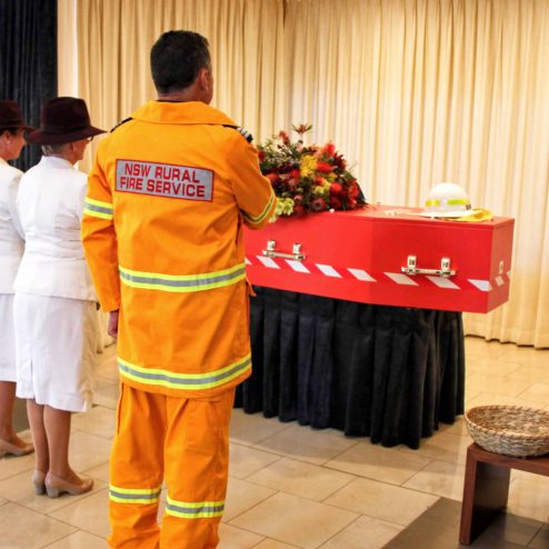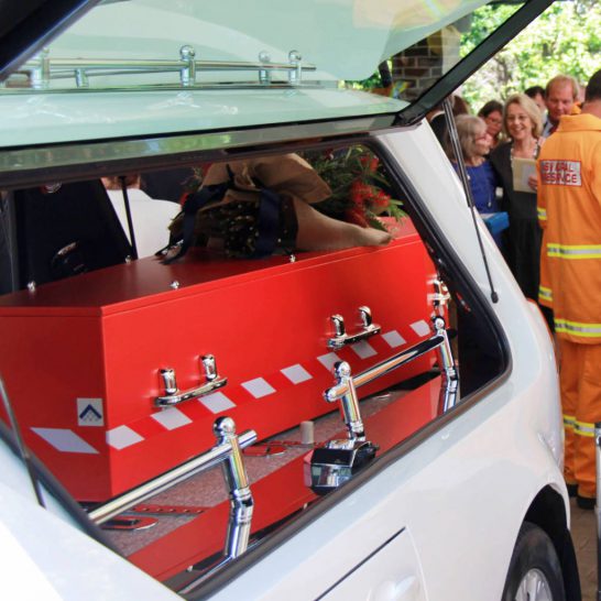 Funerals are usually sombre affairs. The presence of a very brightly coloured coffin in the white hearse, however, lifted spirits and made it clear that this was to be a celebration of Don’s action-packed life. The coffin was painted PMS 1275, the official colour of all NSW bushfire trucks. It had reflective red and white tape down the sides, and chrome handles. A couple of BPG stickers and a set of wheels and Don was ready to get the show underway.